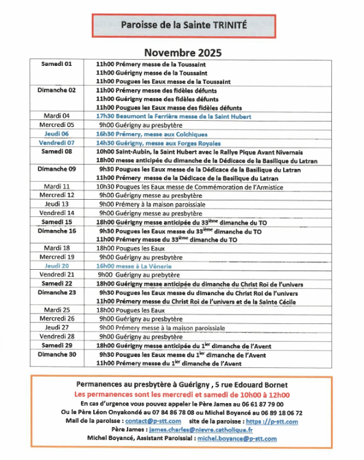 Vous trouverez ci joint l’agenda des messes des communes dépendantes de la Paroisse de la Sainte Trinité