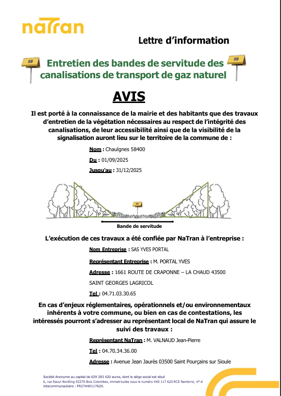 5 Août 2025 Entretien des Bandes de servitude par Commune de Chaulgnes | Classé dans : Non classé | 0 Avis de passage pour l’entretien de la végétation nécessaire au transport de gaz L’exécution de ces travaux se déroulera du 01/09/2025 au 31/12/2025 par l’entreprise SAS Yves PORTAL